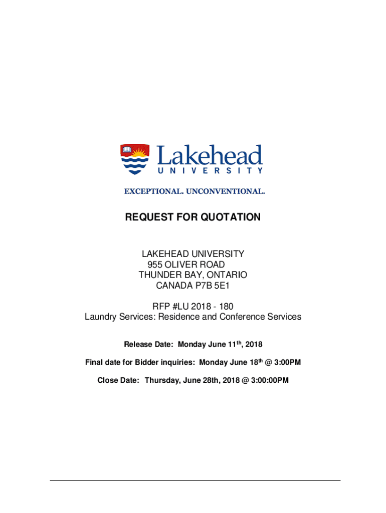 REQUEST FOR QUOTATIONLAKEHEAD UNIVERSITY 955 OLIVER ROAD THUNDER BAY, ONTARIO CANADA P7B 5E1 RFP #LU 2018 180 Laundry Services: Residence and Conference Services Release Date: Monday, June 11th, 2018