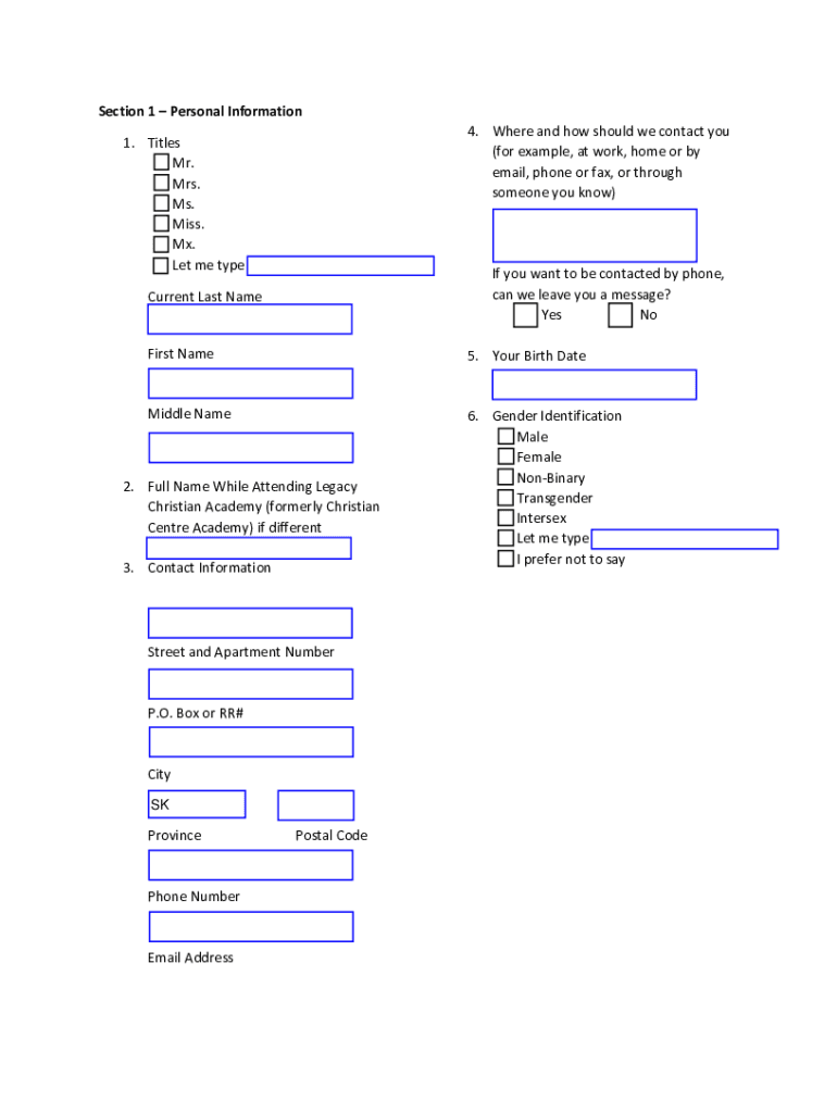 Intake and Assessment Form MILE TWO CHURCH LTD. LEGACY CHRISTIAN ACADEMY (FORMERLY CHRISTIAN Center ACADEMY)200 Princeton Tower 1232nd Avenue South Saskatoon, SK S7K 7E6 Phone: 306.653.2838 Fax: 306.652.4747Getting