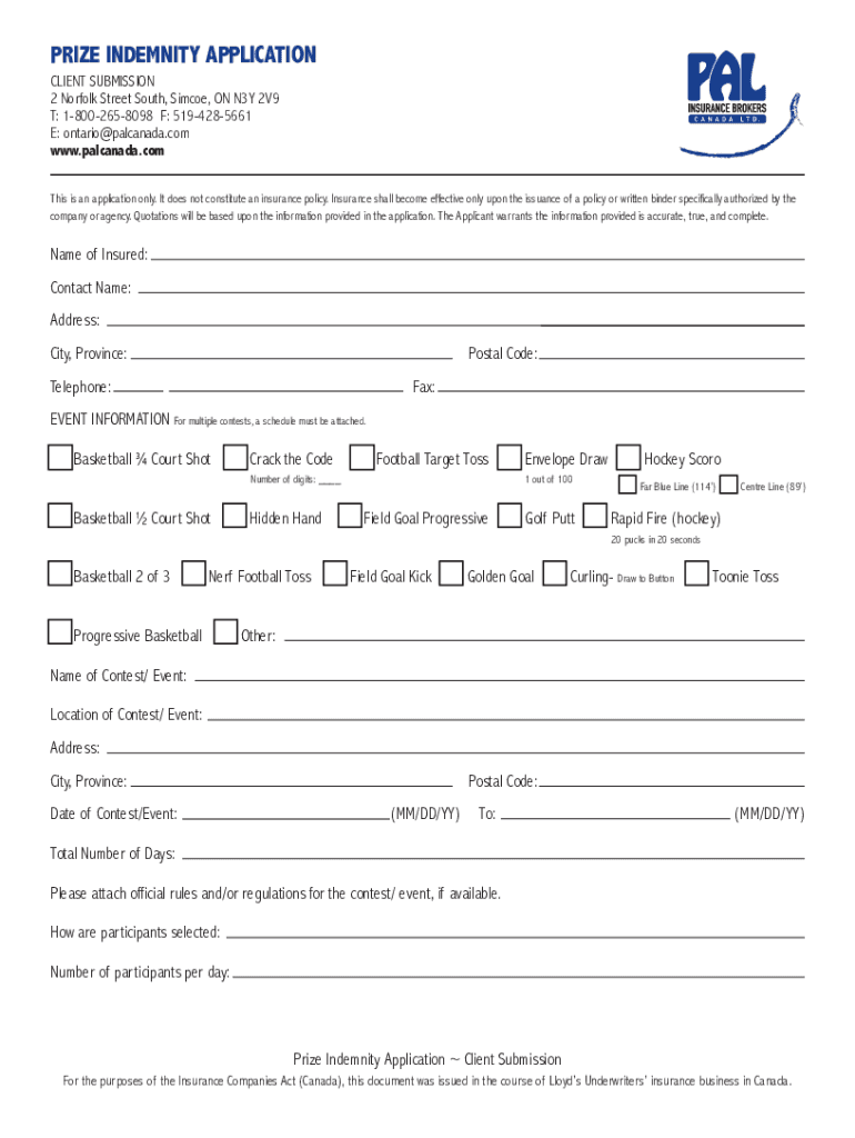 PRIZE INDEMNITY APPLICATION CLIENT SUBMISSION 2 Norfolk Street South, Since, ON N3Y 2V9 T: 18002658098 F: 5194285661 E: ontario@palcanada.com www.palcanada.com This is an application only. It does