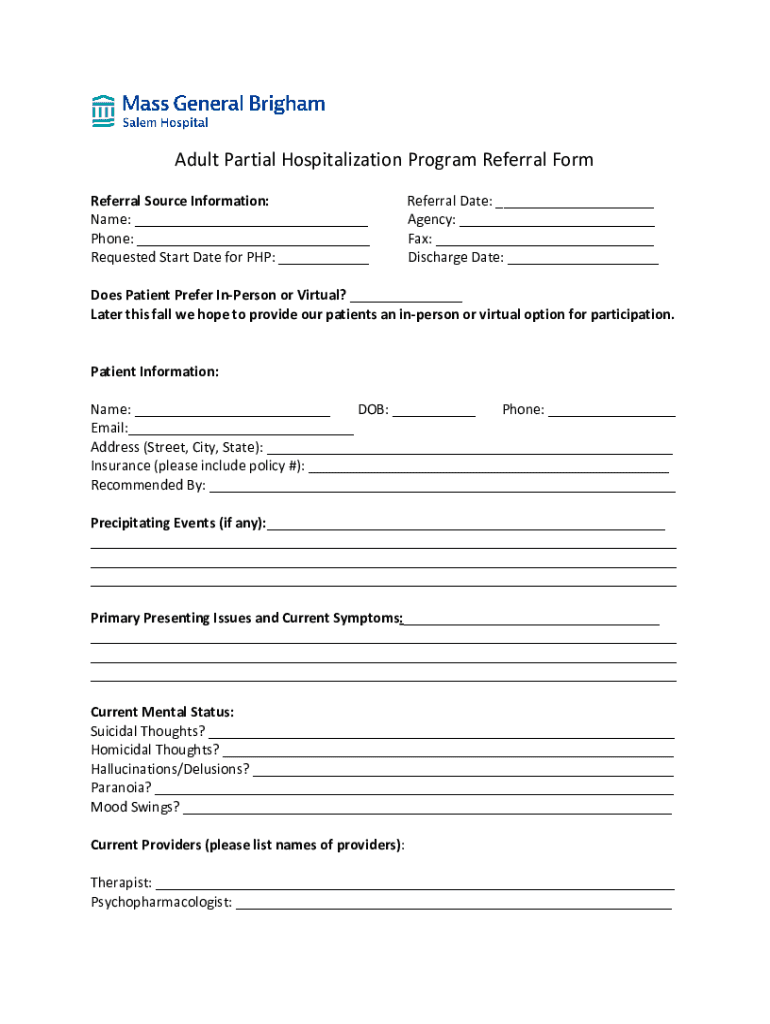 Adult Partial Hospitalization Program Referral Form Referral Source Information: Name: ___ Phone: ___ Requested Start Date for PHP: ___Referral Date: ___ Agency: ___ Fax: ___ Discharge Date: ___Does