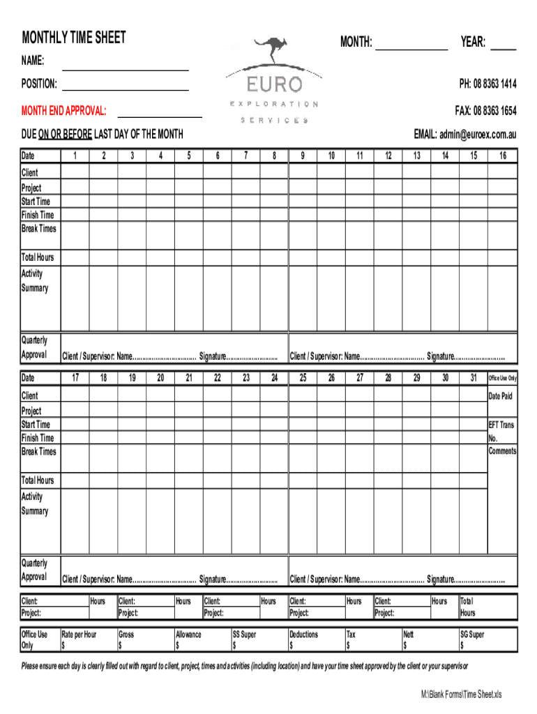 MONTHLY TIME SHEETMONTH: ___NAME:___ POSITION: ___PH: 08 8363 1414MONTH END APPROVAL: ___FAX: 08 8363 1654DUE ON OR BEFORE LAST DAY OF THE MONTH Date1234YEAR: ___EMAIL: admin@euroex.com.au 5678910111213141516Client