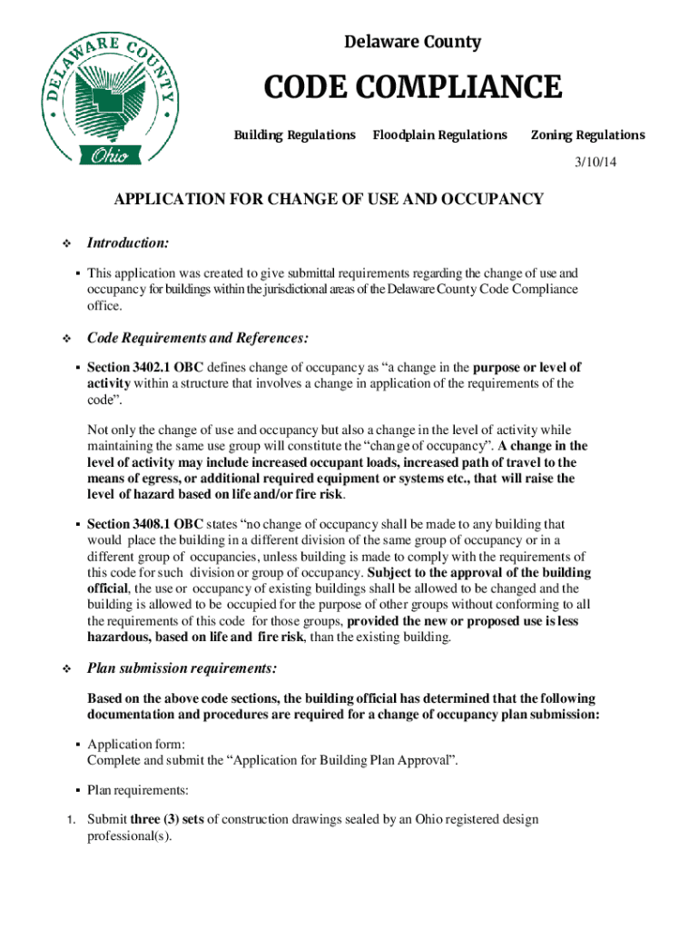 Delaware Countywide COMPLIANCE Building RegulationsFloodplain RegulationsZoning Regulations3/10/14APPLICATION FOR CHANGE OF USE AND OCCUPANCY Introduction: This application was created to give submittal