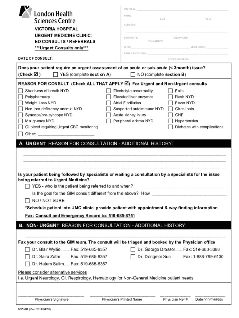 PIN OR J#: ___ NAME: ___ Last First ADDRESS: ___VICTORIA HOSPITAL URGENT MEDICINE CLINIC: ED CONSULTS / REFERRALS ***Urgent Consults only***___ BIRTHDATE: ___ YYY/MM/TELEPHONE: ___OH#:___ VERY. CODE:
