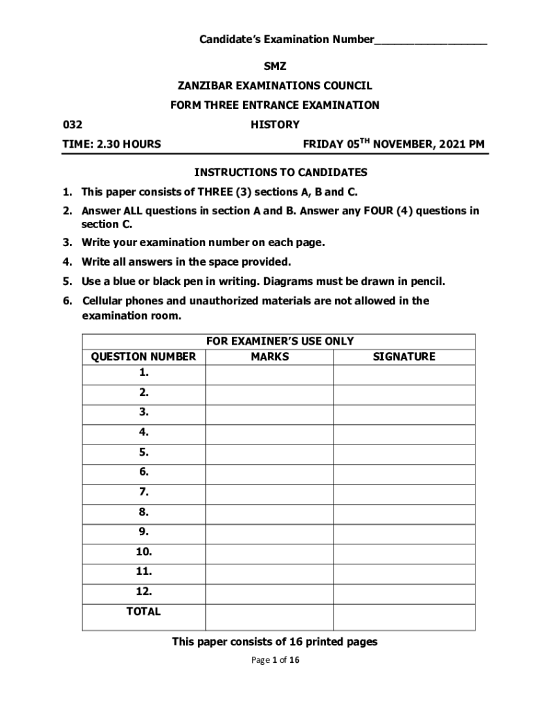 Candidates Examination Number___ SMS ZANZIBAR EXAMINATIONS COUNCIL FORM THREE ENTRANCE EXAMINATION 032HISTORY FRIDAY 05TH NOVEMBER 2021 PM TIME: 2.30 HOURSINSTRUCTIONS TO CANDIDATES 1. This paper