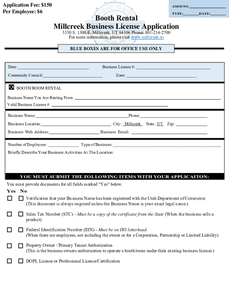 Application Fee: $150 Per Employee: $6AMOUNT:Booth Rental Millcreek Business License ApplicationTYPE:DATE:3330 S. 1300 E. Millcreek, UT 84106 Phone: 8012142700 For more information, please visit www.millcreek.us