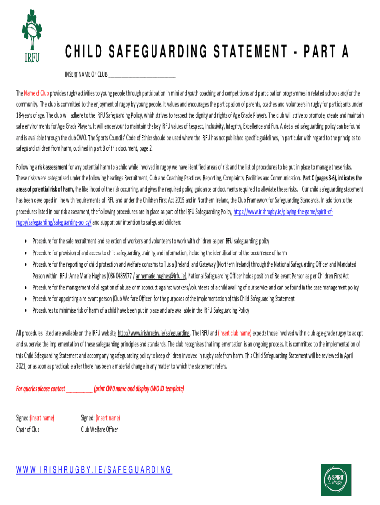 Get the free Child Safeguarding Statement Template