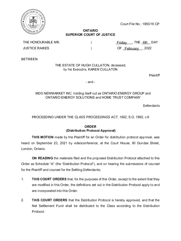 Court File No.: 1850/16 CP ONTARIO SUPERIOR COURT OF JUSTICE THE HONORABLE MR.)JUSTICE RAISES)___, THE ___ 4th DAY Friday OF ___, 2022 FebruaryBETWEEN: THE ESTATE OF HUGH COLLATION, deceased, by his