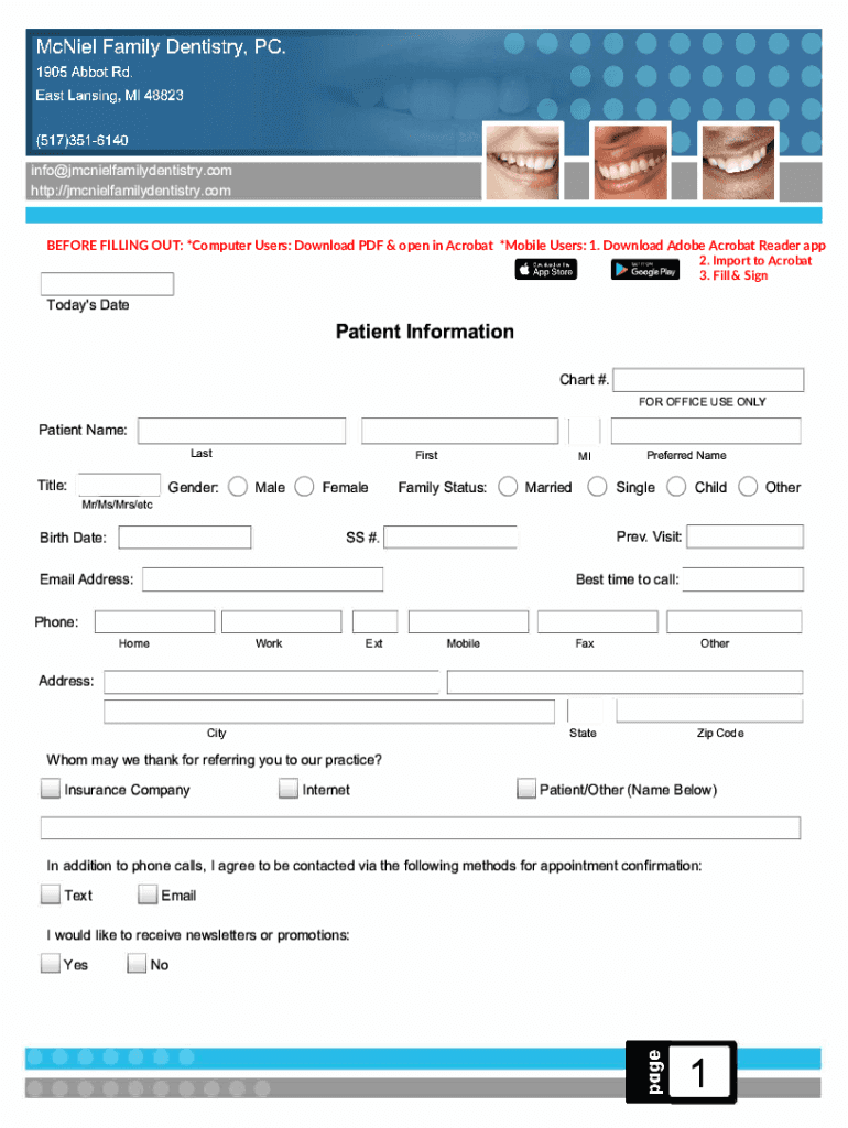 Info@jmcnielfamilydentistry.com http://jmcnielfamilydentistry.com BEFORE FILLING OUT: *Computer Users: Download PDF & open in Acrobat *Mobile Users: 1. Download Adobe Acrobat Reader app 2. Import