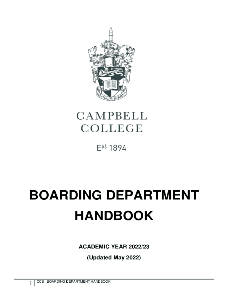 BOARDING DEPARTMENT HANDBOOK ACADEMIC YEAR 2022/23 (Updated May 2022)1CCB BOARDING DEPARTMENT Handbooks booklet provides information on the Boarding Department of Campbell College, also referred to