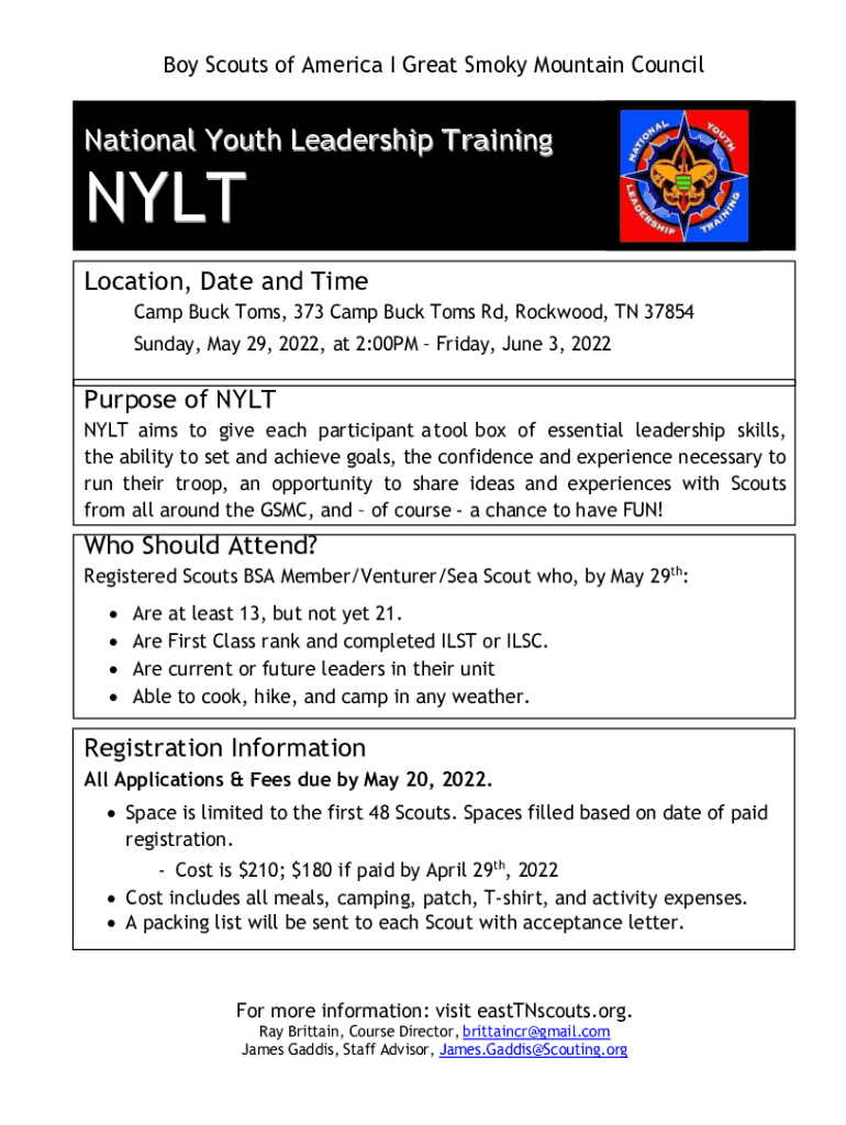 Boy Scouts of America I Great Smoky Mountain CouncilNational Youth Leadership TrainingNYLTLocation, Date and Time Camp Buck Toms, 373 Camp Buck Toms Rd, Lockwood, TN 37854 Sunday, May 29, 2022, at