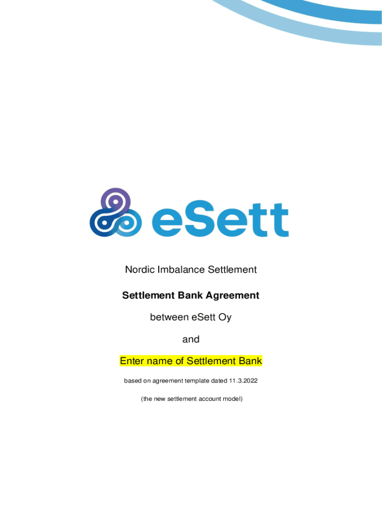 Nordic Imbalance Settlement Bank Agreement between sett Of and Enter name of Settlement Bank based on agreement template dated 11.3.2022 (the new settlement account model)imitable of contents 1General