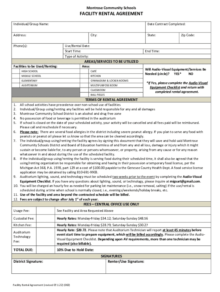 MontroseCommunitySchoolsFACILITYRENTALAGREEMENT Individual/Groupware: DateContractCompleted:Address:City:Phone(s):State:Use/Retaliate: Starting: Hyperactivity:Opcode: Entire:AREAS/SERVICESTOBEUTILIZED