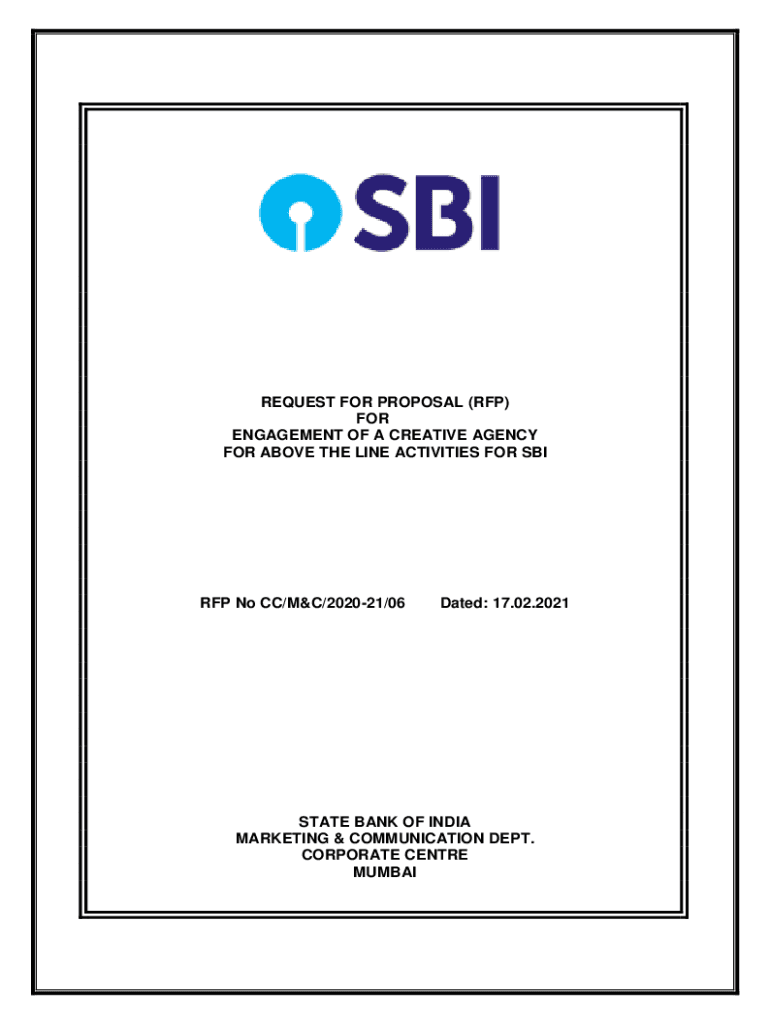 REQUEST FOR PROPOSAL (RFP) FOR ENGAGEMENT OF A CREATIVE AGENCY FOR ABOVE THE LINE ACTIVITIES FOR SBI RFP No CC/M&C/202021/06Dated: 17.02.2021STATE BANK OF INDIA MARKETING & COMMUNICATION DEPT. CORPORATE