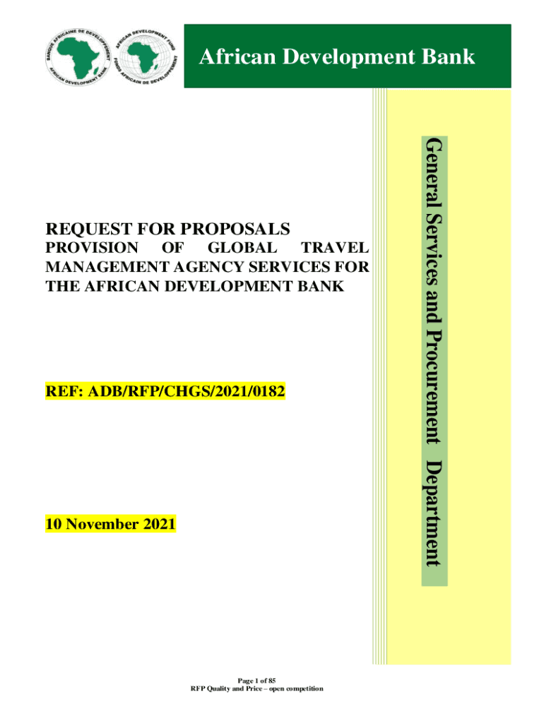 African Development BankPROVISION OF GLOBAL TRAVEL MANAGEMENT AGENCY SERVICES FOR THE AFRICAN DEVELOPMENT BANKER: ADB/RFP/CGS/2021/018210 November 2021Page 1 of 85 RFP Quality and Price open competitionGeneral