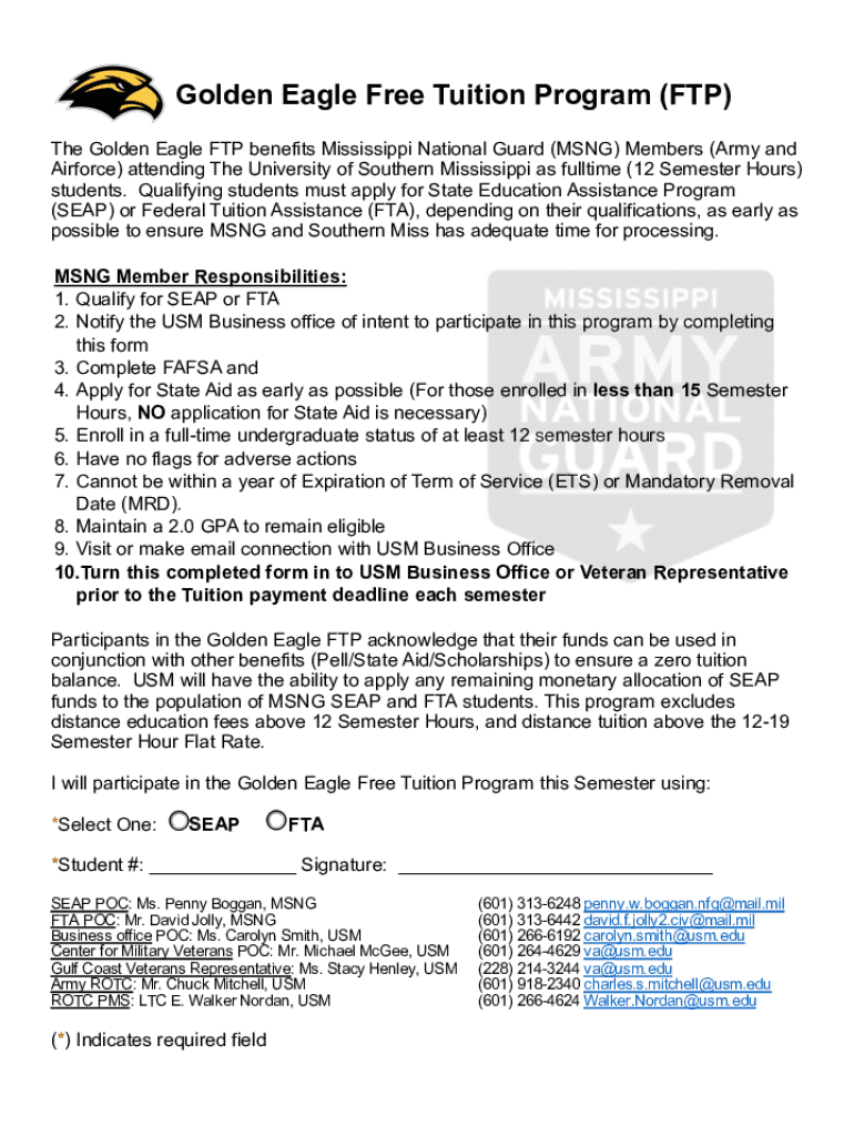 Golden Eagle Free Tuition Program (FTP) The Golden Eagle FTP benefits Mississippi National Guard (MSN) Members (Army and Air force) attending The University of Southern Mississippi as full time (12