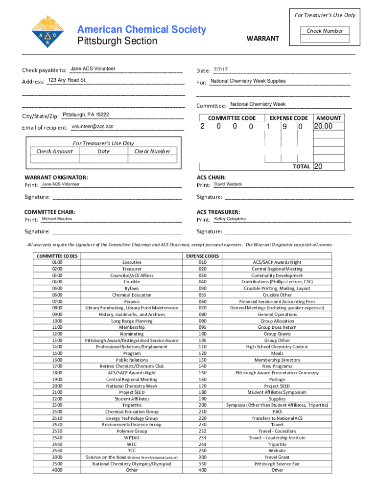 WARRANT SUBMISSION PROCEDUREAMERICAN CHEMICAL SOCIETY PITTSBURGH Section receive reimbursement for valid ACS Pittsburgh Section expenditures or to receive group allocation funds, you must submit a