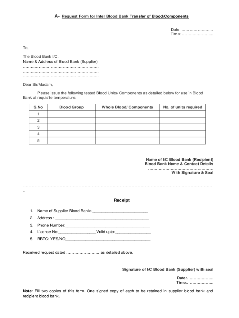 A Request Form for Inter Blood Bank Transfer of Blood/Components Date: ... Time: ... To, The Blood Bank I/C, Name & Address of Blood Bank (Supplier) Dear Sir/Madam, Please issue the following tested