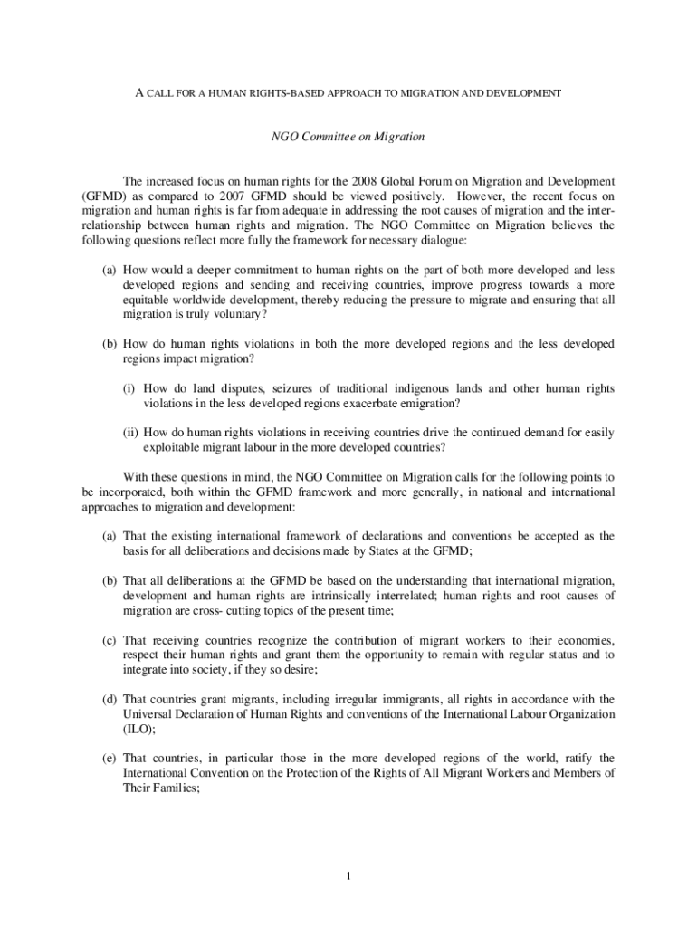 A CALL FOR A HUMAN RIGHTSIZED APPROACH TO MIGRATION AND DEVELOPMENT Committee on Migration increased focus on human rights for the 2008 Global Forum on Migration and Development (GMD) as compared