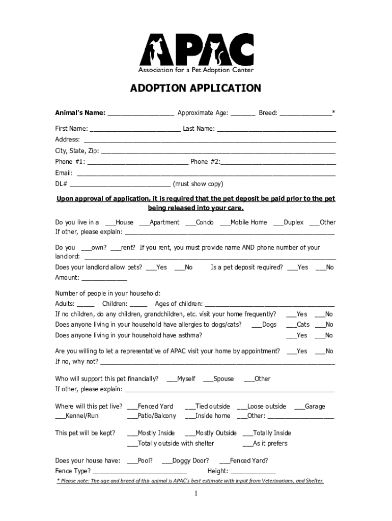 ADOPTION APPLICATION Animals Name: ___ Approximate Age: ___ Breed: ___* First Name: ___ Last Name: ___ Address: ___ City, State, Zip: ___ Phone #1: ___ Phone #2:___ Email: ___ DL# ___ (must show copy)