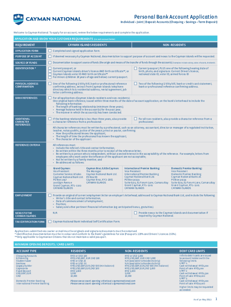 Personal Bank Account Application Individual Joint | Deposit Accounts (Cheating Savings Term Deposit) Welcome to Cayman National. To apply for an account, review the below requirements and complete