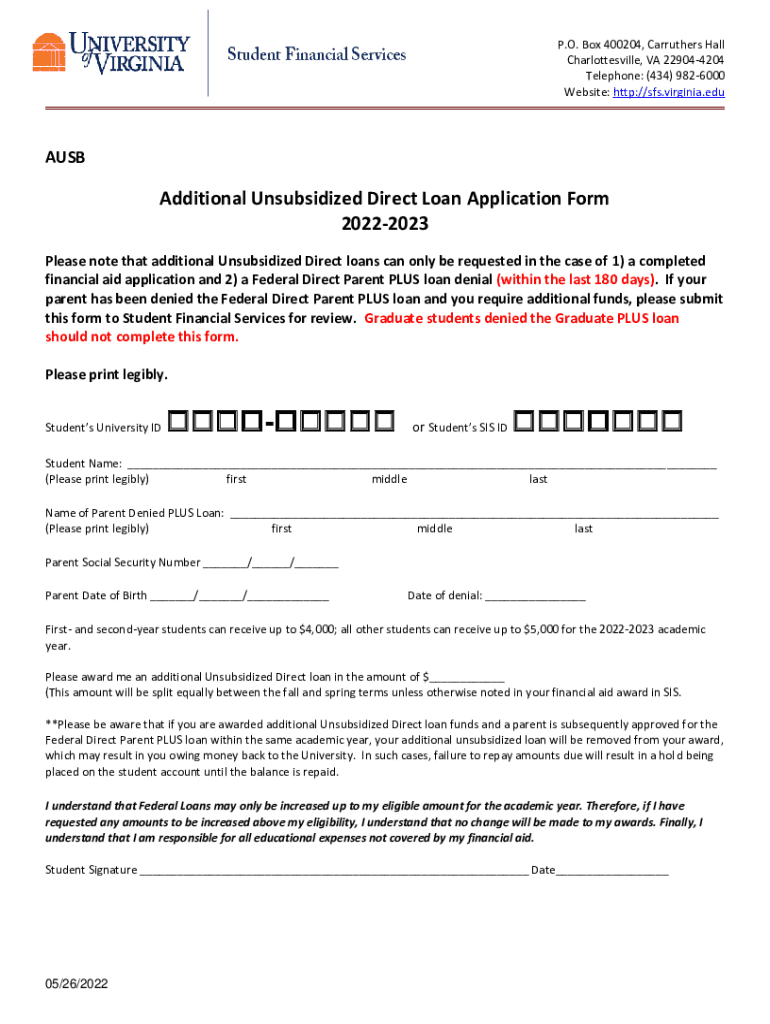 P.O. Box 400204, Carriers Hall Charlottesville, VA 229044204 Telephone: (434) 9826000 Website: http://sfs.virginia.eduAUSBAdditional Unsubsidized Direct Loan Application Form 20222023 Please note