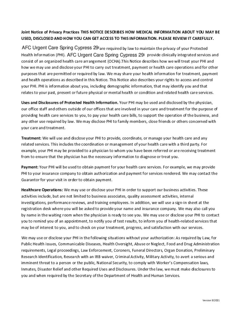 Joint Notice of Privacy Practices THIS NOTICE DESCRIBES HOW MEDICAL INFORMATION ABOUT YOU MAY BE USED, DISCLOSED AND HOW YOU CAN GET ACCESS TO THIS INFORMATION. PLEASE REVIEW IT CAREFULLY.AFC Urgent