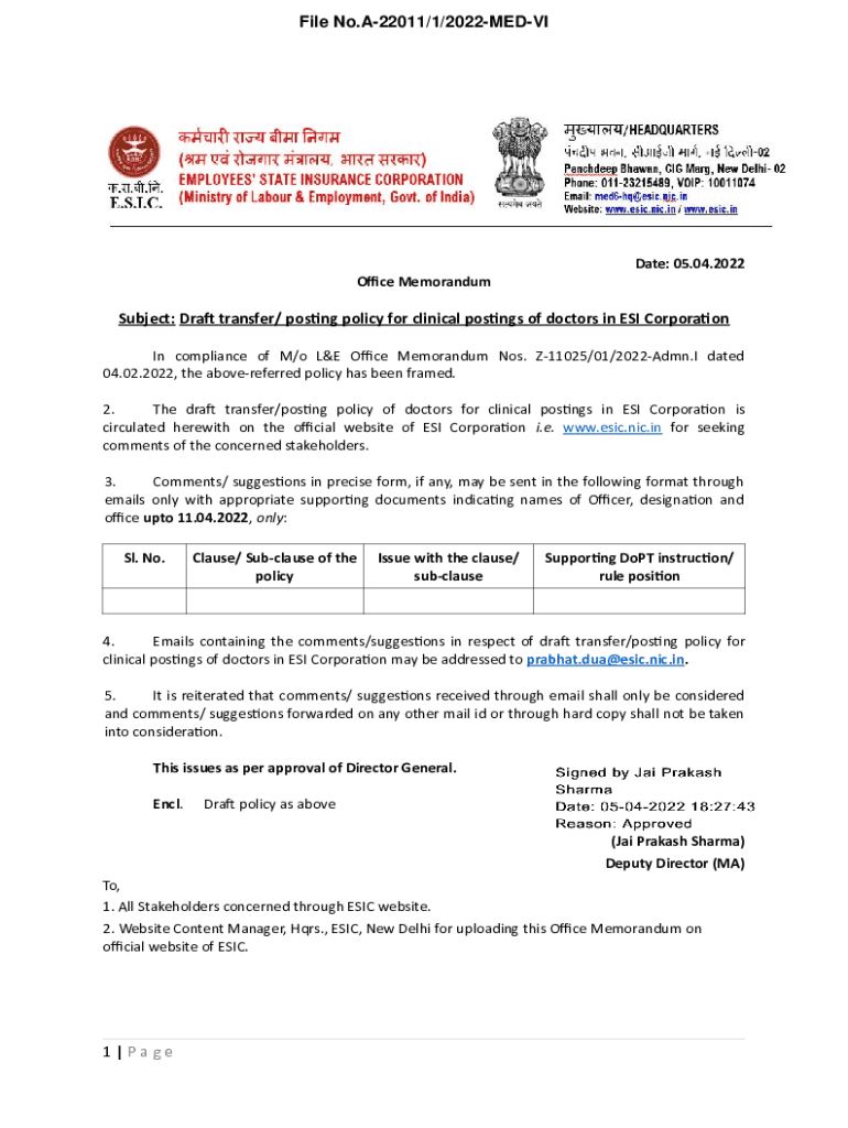 File No. A22011/1/2022MEDVIDate: 05.04.2022 Office MemorandumSubject: Draft transfer/ posting policy for clinical postings of doctors in ESI Corporation In compliance of M/o L&E Office Memorandum