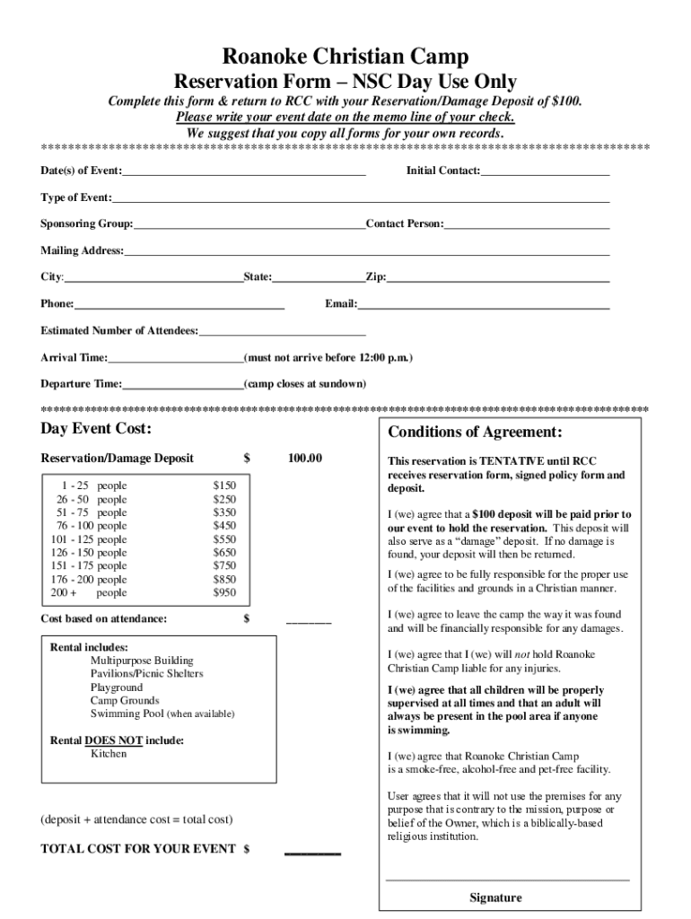 Roanoke Christian Camp Reservation Form NSC Day Use Only Complete this form & return to RCC with your Reservation/Damage Deposit of $100. Please write your event date on the memo line of your check.