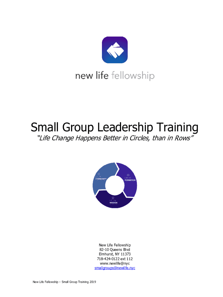 Small Group Leadership Training Life Change Happens Better in Circles, than in Owned Life Fellowship 8210 Queens Blvd Elmhurst, NY 11373 7184240122 ext 112 www.newlife@nyc smallgroups@newlife.nycNew