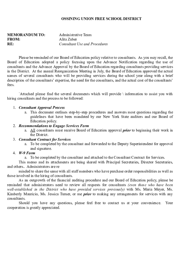 ASSIGNING UNION FREE SCHOOL DISTRICTMEMORANDUM TO: FROM: RE:Administrative Team Anita Huber Consultant Use and ProceduresPlease be reminded of our Board of Education policy relative to consultants.