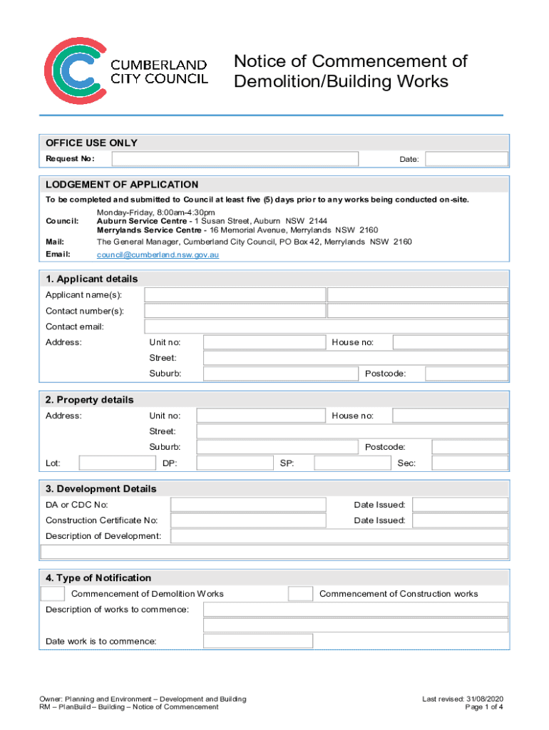Notice of Commencement of Demolition/Building WorksOFFICE USE ONLY Request No:Date:JUDGEMENT OF APPLICATION To be completed and submitted to Council at least five (5) days prior to any works being