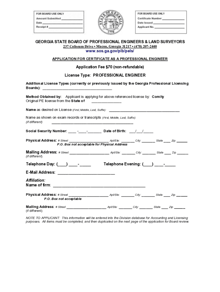 GEORGIA STATE BOARD OF PROFESSIONAL ENGINEERS & LAND SURVEYORS 237 Coliseum Drive Macon, Georgia 31217 (478) 2072440www.sos.ga.gov/plb/pels/ APPLICATION FOR CERTIFICATE AS A PROFESSIONAL ENGINEERApplication