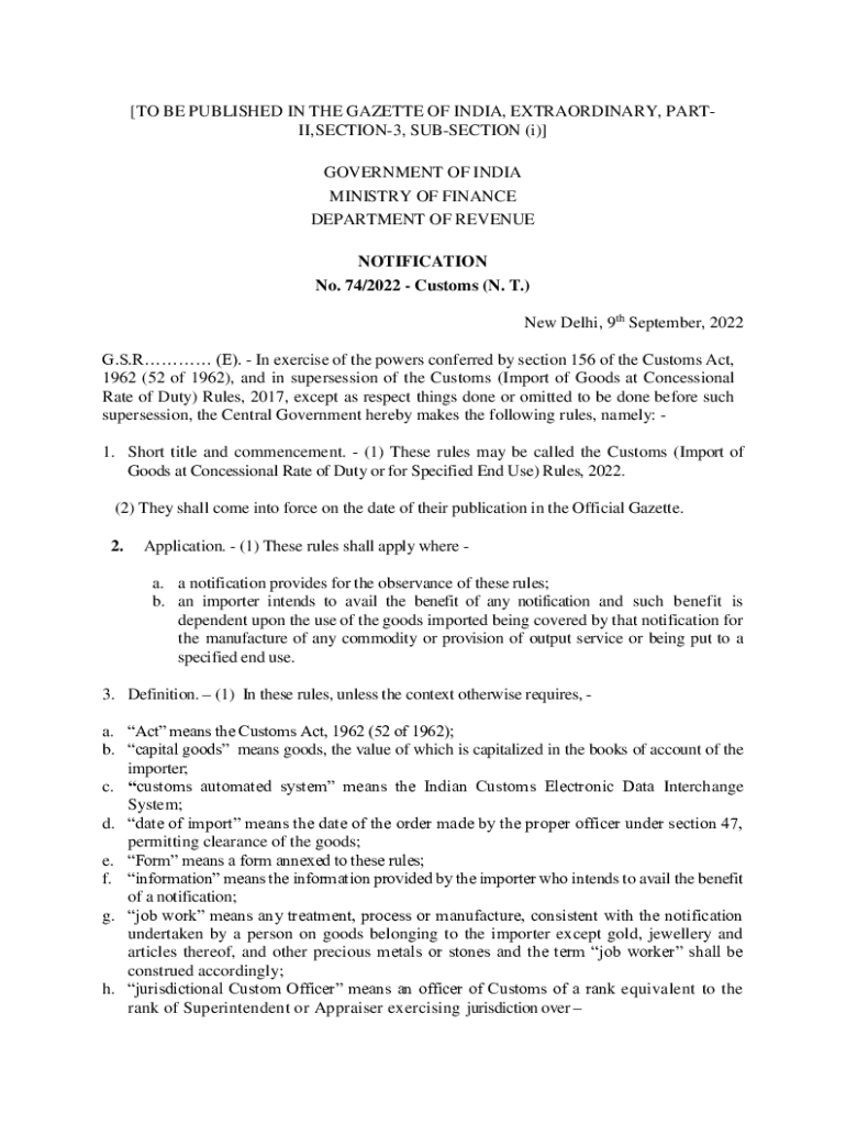 [TO BE PUBLISHED IN THE GAZETTE OF INDIA, EXTRAORDINARY, PART, SECTION3, SUBSECTION (i)] GOVERNMENT OF INDIA MINISTRY OF FINANCE DEPARTMENT OF REVENUE NOTIFICATION No. 74/2022 Customs (N. T.) New