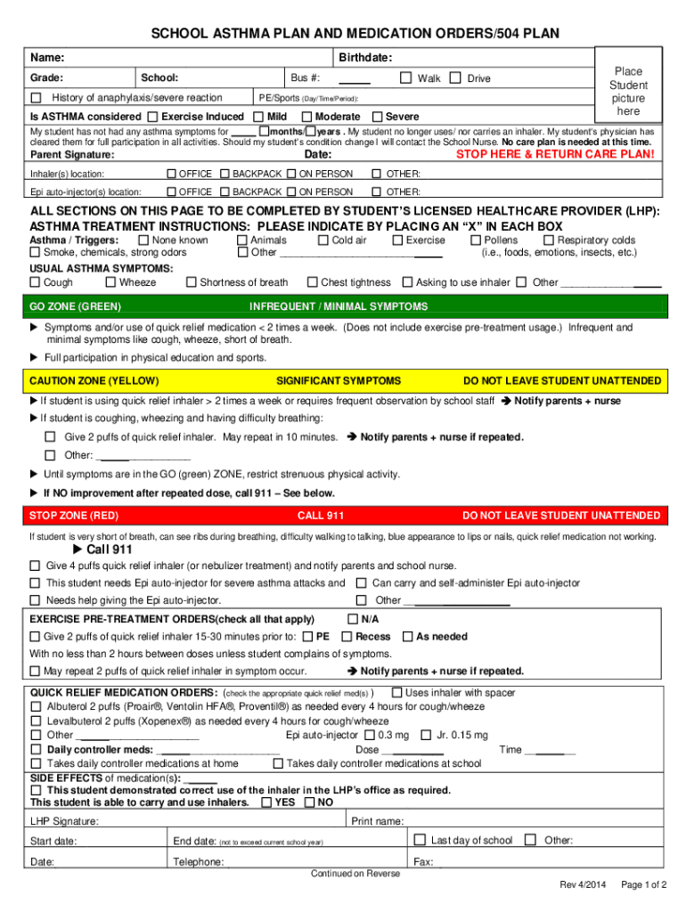 SCHOOL ASTHMA PLAN AND MEDICATION ORDERS/504 PLAN Name:Birthdate:Grade:School:Bus #:History of anaphylaxis/severe reaction Is ASTHMA consideredWalkPlace Student picture hereDrivePE/Sports (Day/Time/Period):Exercise