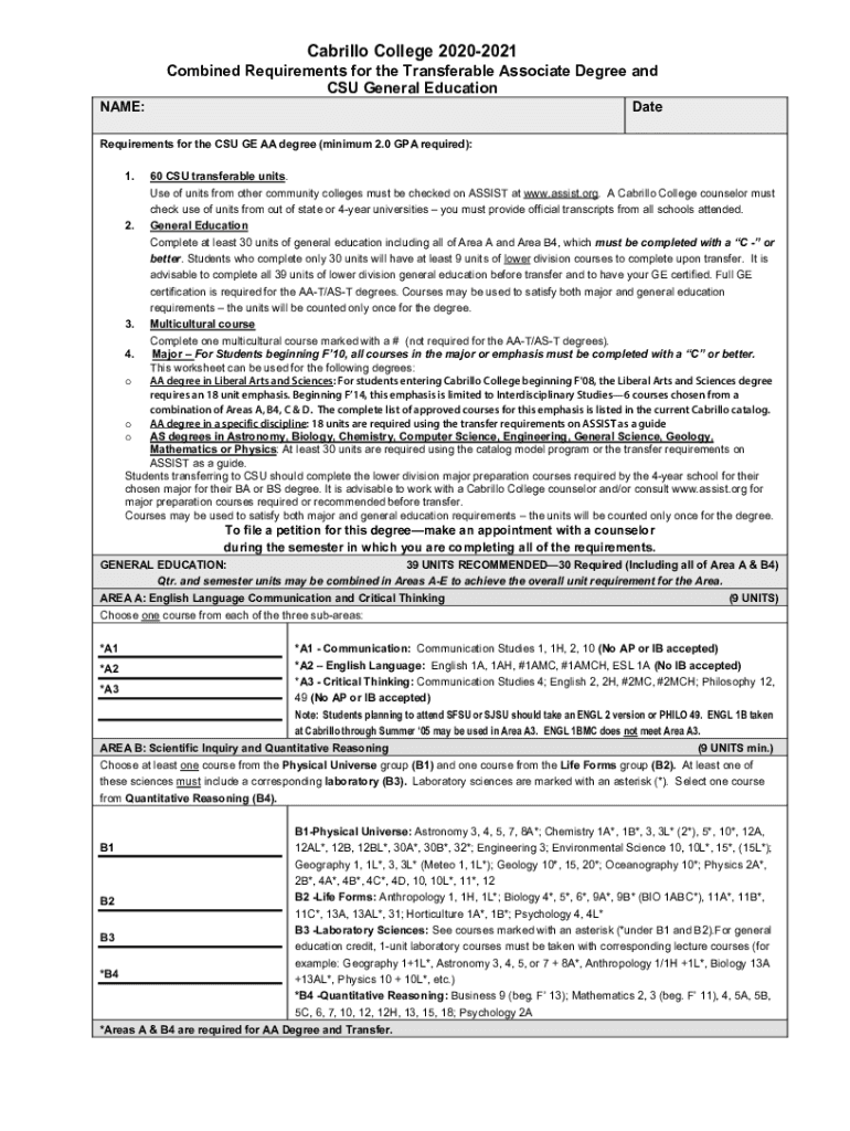 Cabrillo College 20202021 Combined Requirements for the Transferable Associate Degree and CSU General Education NAME:DateRequirements for the CSU GE AA degree (minimum 2.0 GPA required): 1.60 CSU
