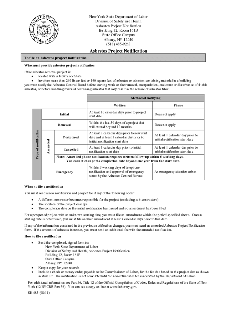 New York State Department of Labor Division of Safety and Health Asbestos Project Notification Building 12, Room 161B State Office Campus Albany, NY 12240 (518) 4859263Asbestos Project Notification