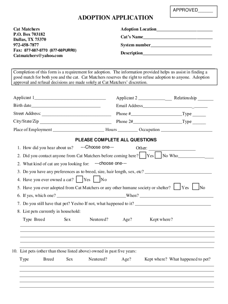 APPROVED___ADOPTION APPLICATION Cat Matchers P.O. Box 703182 Dallas, TX 75370 9724587877 Fax: 8776878770 (87768PURR0) Catmatchers@yahoo.comAdoption Location___ Cats Name___ System number___ Description___Completion