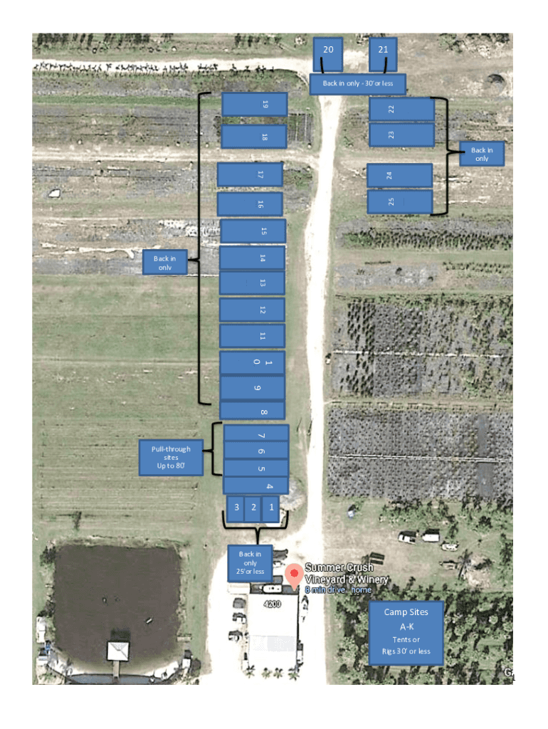 2021Back in only 30or less18232219Back in only16252417 15 14Back in only13 12 111 0 9 8 7 6Pullthrough sites Up to 805 4 321Back in only 25or decamp Sites AK Tents or Rigs 30 or less1SUMMER CRUSH
