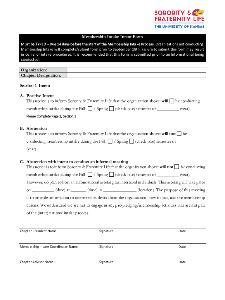 Membership Intake Intent Form Must be TYPED Due 14 days before the start of the Membership Intake Process. Organizations not conducting Membership Intake will complete/submit form prior to September