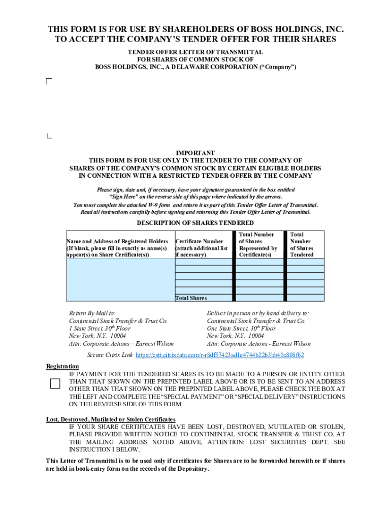THIS FORM IS FOR USE BY SHAREHOLDERS OF BOSS HOLDINGS, INC. TO ACCEPT THE COMPANY TENDER OFFER FOR THEIR SHARES TENDER OFFER LETTER OF TRANSMITTAL FOR SHARES OF COMMON STOCK OF BOSS HOLDINGS, INC.,
