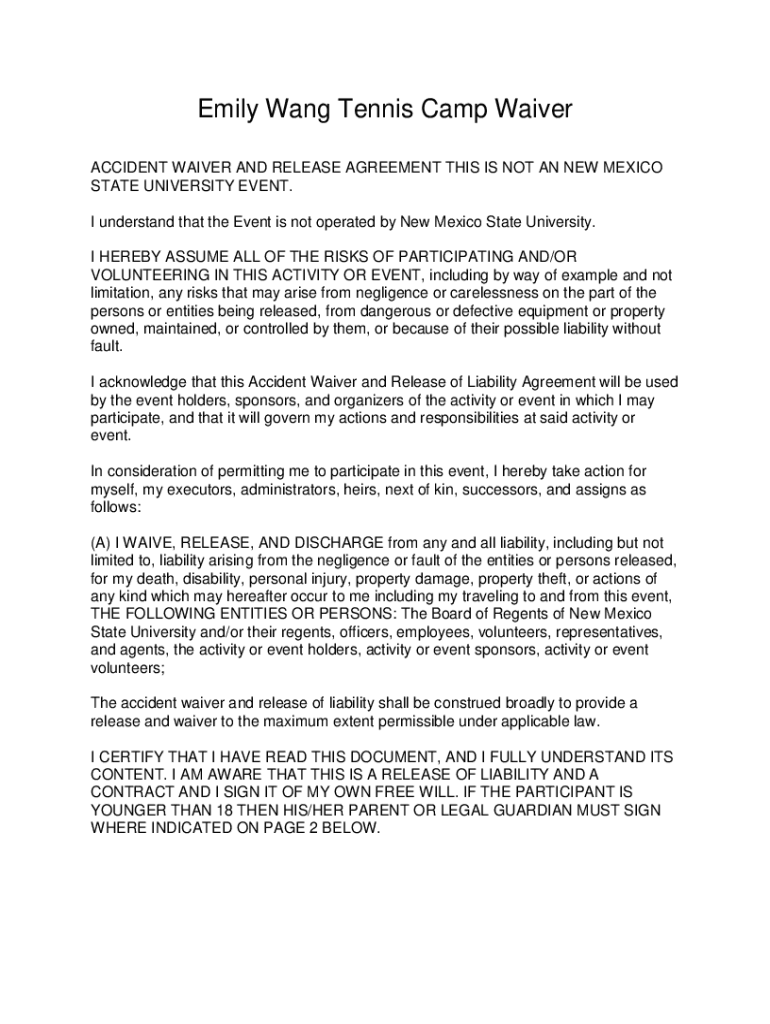 Emily Wang Tennis Camp Waiver ACCIDENT WAIVER AND RELEASE AGREEMENT THIS IS NOT AN NEW MEXICO STATE UNIVERSITY EVENT. I understand that the Event is not operated by New Mexico State University. I