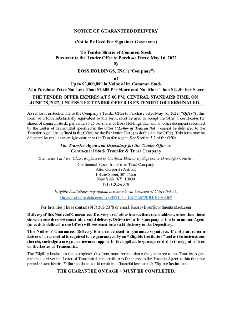 NOTICE OF GUARANTEED DELIVERY (Not to Be Used For Signature Guarantee) To Tender Shares of Common Stock Pursuant to the Tender Offer to Purchase Dated May 16, 2022, by BOSS HOLDINGS, INC. (Company)