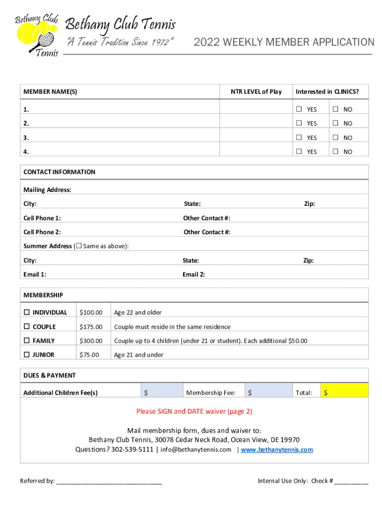 A Tennis Tradition Since 19722022 WEEKLY MEMBER APPLICATIONMEMBER NAME(S)NTR LEVEL of PlayInterested in CLINICS?1. YES NO2. YES NO3. YES NO4. YES NONCONTACT INFORMATION