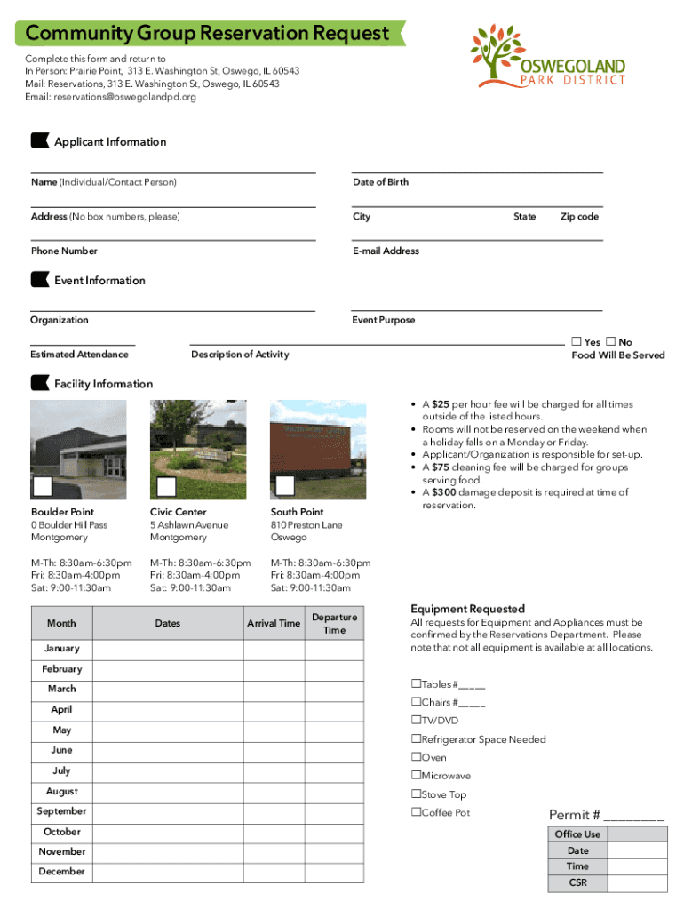 Mail: Reservations, 313 E. Washington St, Oswego, IL 60543Email: