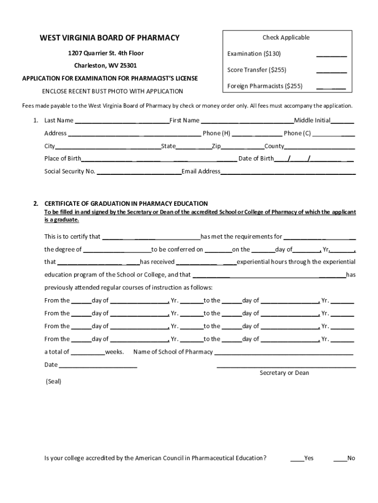 WEST VIRGINIA BOARD OF PHARMACYCheck Applicable1207 Quarries St. 4th Floor Charleston, WV 25301Examination ($130)___Score Transfer ($255)___Foreign Pharmacists ($255)__APPLICATION FOR EXAMINATION