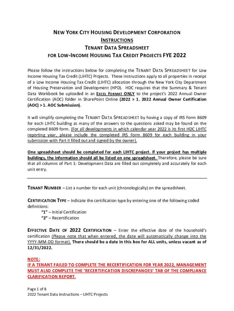 NEW YORK CITY HOUSING DEVELOPMENT CORPORATION INSTRUCTIONS TENANT DATA SPREADSHEET FOR INCOME HOUSING TAX CREDIT PROJECTS FYE 2022 Please follow the instructions below for completing the TENANT DATA