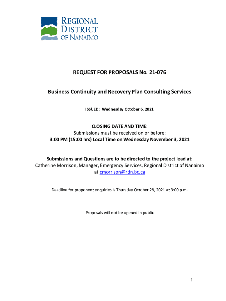 REQUEST FOR PROPOSALS No. 21076 Business Continuity and Recovery Plan Consulting Services ISSUED: Wednesday, October 6, 2021CLOSING DATE AND TIME: Submissions must be received on or before: 3:00 PM