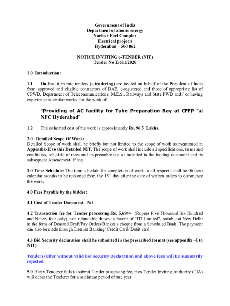 Government of India Department of atomic energy Nuclear Fuel Complex Electrical projects Hyderabad 500 062 NOTICE INVITING tender (NIT) Tender No E/611/2020 1.0 Introduction: 1.1 Online item rate