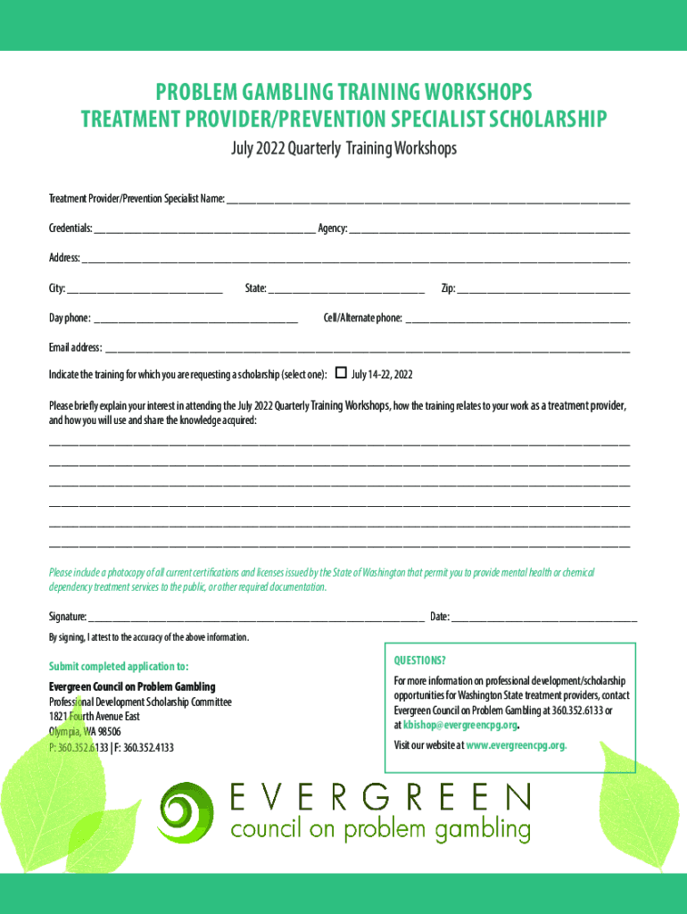 PROFESSIONAL DEVELOPMENT/SCHOLARSHIP OPPORTUNITIES FOR WASHINGTON STATE TREATMENT PROVIDERS, PREVENTION SPECIALISTS, PEER/RECOVERY COACHES, EDUCATORS, STUDENTS Thank you for your interest in the professional