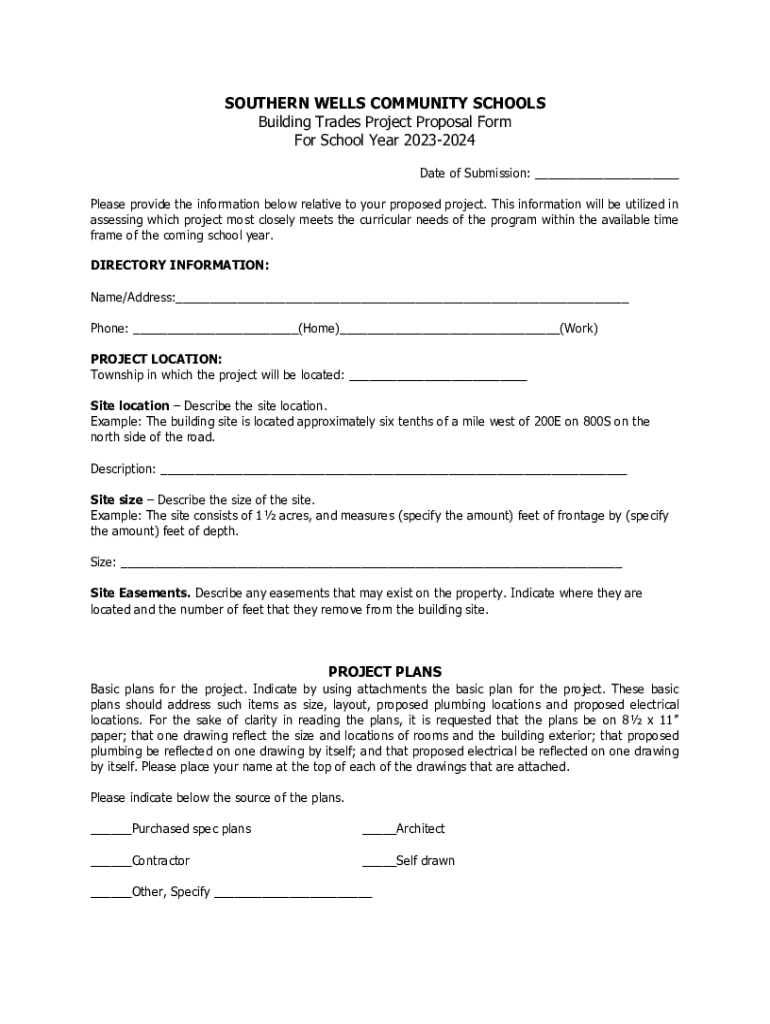 SOUTHERN WELLS COMMUNITY SCHOOLS Building Trades Project Proposal Form For School Year 20232024 Date of Submission: ___ Please provide the information below relative to your proposed project. This